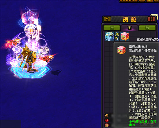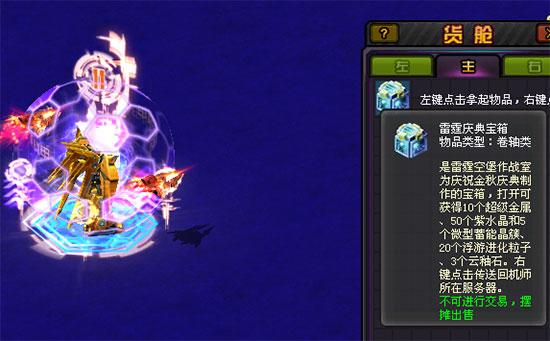 你离开了雷霆空堡,今晚真是满载收获而归啊!不过宝箱到哪里去了呢?别急,金秋庆典大使·萱萱正等着你。原来为防宝箱受到损伤,雷霆空堡相当贴心地帮你把获得的宝箱跳跃传送到了她那儿。只要在当天23:59前向金秋庆典大使·萱萱领取宝箱,这次活动就圆满完成了哦!