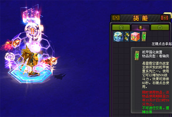 雷霆战歌宝箱需要持有满1分钟才能真正属于你,周围的机师怎么会让你顺顺利利地抢到呢?别急,现在就是使用机甲装置的时候啦!用机甲强化装置增加战斗力,机甲防御装置获得攻击免疫,机甲冷冻装置定身附近的机师,现在你在舰桥中已经所向无敌啦!