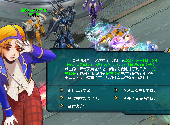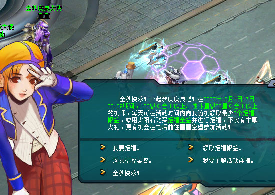 热热闹闹金秋庆典,缤纷礼物送不停!2025年10月1日7:00-10月7日23:59,持有庆典福徽的机师可前往钢铁巨舰的金秋庆典大使·萱萱处,前往雷霆空堡!