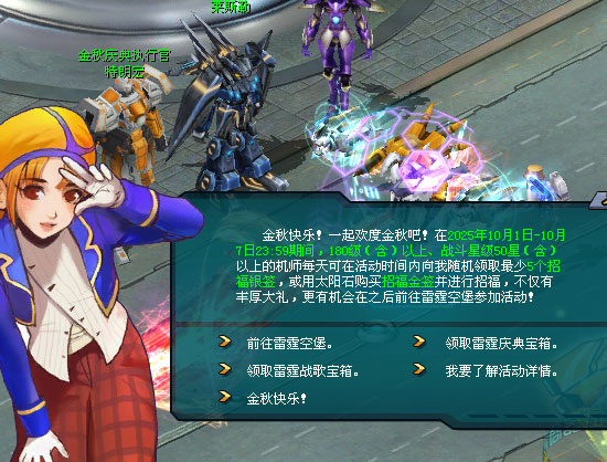 1、2025年10月1日7:00-10月7日23:59,每晚22:15-22:40,持有庆典福徽的机师可前往钢铁巨舰(512,778)的金秋庆典大使·萱萱处,前往雷霆空堡。 2、前往跨服服务器钢铁巨舰后,将有雷霆空堡引导员接待。持有庆典福徽的机师可向引导员申请进入空堡权限。 3、进入雷霆空堡后,机师会被随机投放入星光哨站、前沿哨站和要塞哨站3个哨站之一。 4、在哨站中机师可以击败雷霆蛋兵获得雷霆庆典宝箱。也可以击败机甲维护员,获得它们身上的机甲装置,帮助更好地战斗。 5、雷霆空堡作战室会定时在空间锚定舰桥投放雷霆蛋兵和雷霆战歌宝箱。拾取宝箱满1分钟后可持有该宝箱。要注意的是,持有宝箱的1分钟内是无法离开空间锚定舰桥。 6、活动结束后回到钢铁巨舰,可向金秋庆典大使·萱萱领取在雷霆空堡中获得的宝箱。 |
