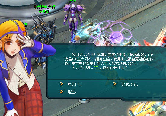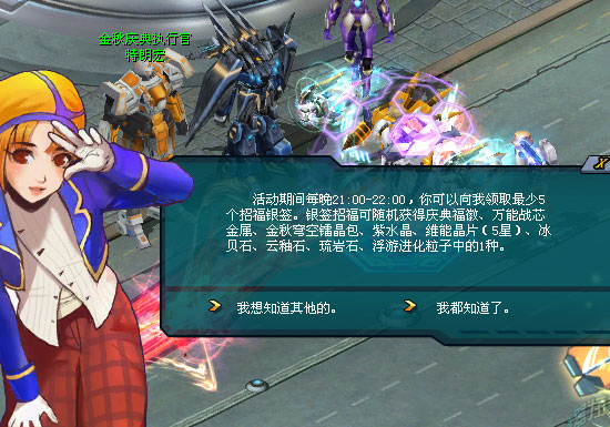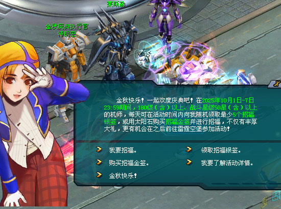 金秋庆典大使·萱萱正兴高采烈地等着你们,准备发放招福银签。符合条件的机师,每天都可以向她领取最少5个招福银签。拥有这些银签就可以在他的帮助下进行招福,抽取随机庆典大礼!