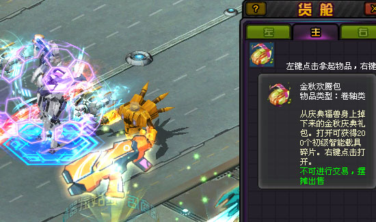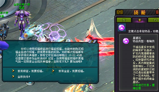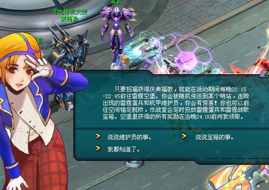 每次招福都能够积累福气值,就在大家欢乐地进行招福之际,钢铁巨舰传来了通知,绿色星球地下A区出现了雷霆蛋兵!原来这也是金秋庆典大使·萱萱特别准备的庆典惊喜,除了地下A区,还有地下C区和星河栈道也会出现雷霆蛋兵,礼物一次比一次丰厚哦!现在快先前往A区击败雷霆蛋兵,获得它携带的金秋庆典礼包吧!