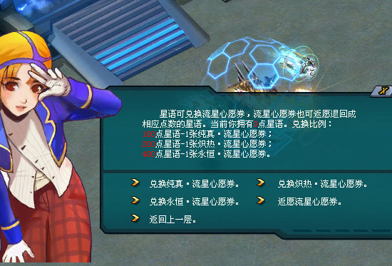 那么,怎么才能召唤出星际星兽呢? 使用流星心愿券。 在星光乐园的流星使者·星漫处,可通过星语兑换流星心愿券。 流星心愿券共有3种,每种流星心愿券都可随机召唤出1位星际星兽,越高级的流星心愿券召唤出高级星兽的可能性越大。 100点星语可兑换1张纯真·流星心愿券;200点星语可兑换1张炽热·流星心愿券;400点星语可兑换1张永恒·流星心愿券。