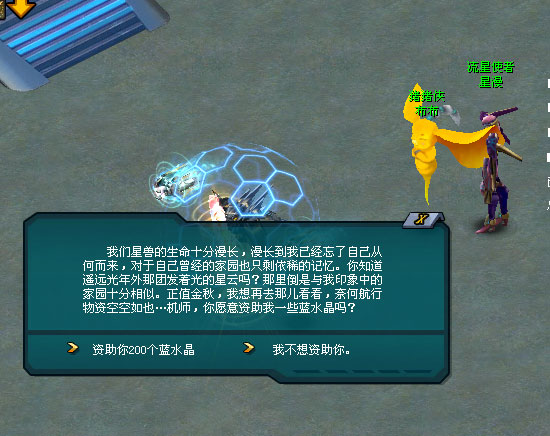 黄色是布布的守护色,也是她的力量源泉。在星兽那悠长如史诗般的生命旅程中,布布对于它最初家园的记忆,就像晨雾中的露珠,随着时间的微风渐渐蒸发,变得越发模糊和遥远。那些曾经鲜明的景象,如同古老的星图,被新的探险和星际间的奇遇所覆盖,逐渐褪色成心底深处的一抹温柔的怀念。 在遥远的光年之外,有一团散发着柔和光芒的星云,它的光芒如同遥远古谣中的灯塔,隐约与布布记忆中那些模糊的家园景象产生了共鸣。布布渴望穿越无垠的宇宙,去探寻那片似乎与它的起源有着千丝万缕联系的神秘之地。然而,布布的航行物资匮乏,星舰储备舱空荡荡,无法支持这趟遥远的探索之旅…… 机师,你愿意资助布布200个蓝水晶,实现她远行的心愿吗?