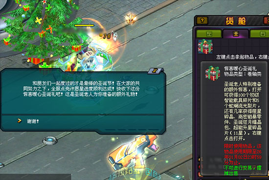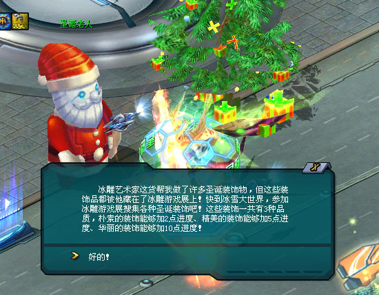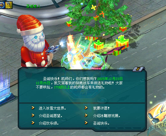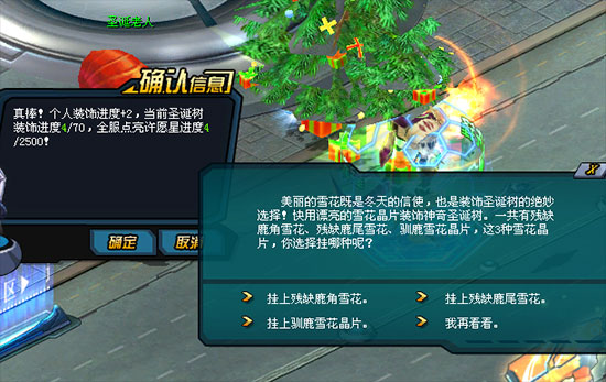 但你不知道从哪获得圣诞树的装饰品,于是圣诞老人告诉你——你可前往冰雪大世界,参与冰雕游戏展,就能获得各种圣诞树装饰品。 而每天都有圣诞树装饰进度,只有完成当日的圣诞树装饰进度,才能向他许愿哦!许愿之后,第二天上线时,你到奇妙圣诞树那儿就能收获许愿礼物。