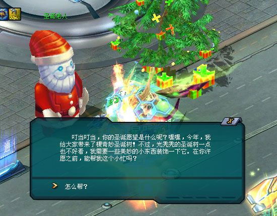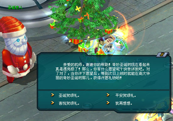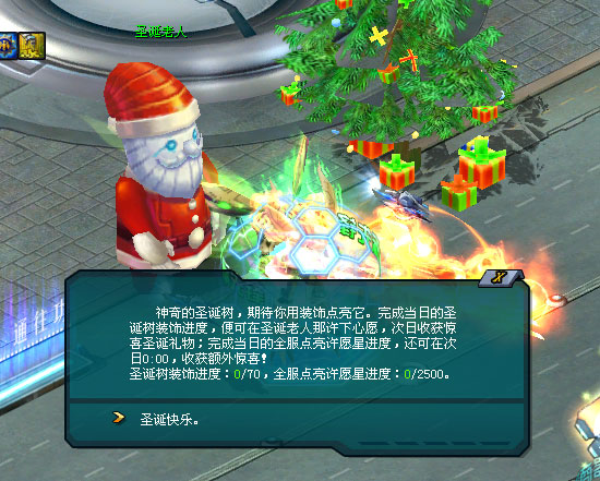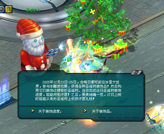 接着圣诞老人又指向巧妙圣诞树顶上那颗璀璨的许愿星,对你说:“为奇妙圣诞树挂上装饰,不仅能增加圣诞树装饰进度,也能增加全服点亮许愿星进度。” 若当日的全服点亮许愿星进度被完成,即可点亮圣诞许愿星。第二天你可到奇妙圣诞树那儿领取圣诞老人准备的额外惊喜!