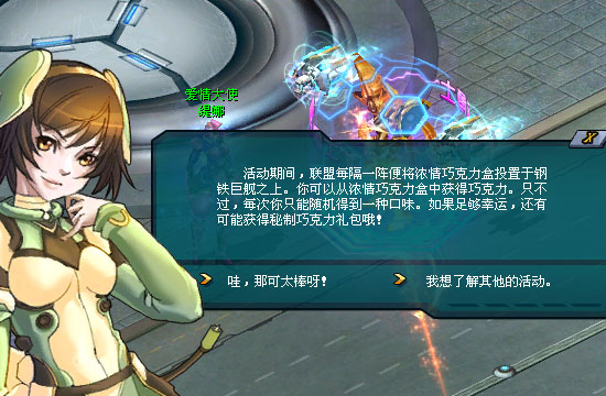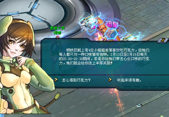 活动开始了。钢铁巨舰上站着4位美丽的小姐姐,脱单的机会就在眼前,还不赶紧去拾取巧克力博佳人一笑? 每种巧克力都有着不同的爱情含义,而这些奥妙,就在与小姐姐的对话中,需要你用心体会。