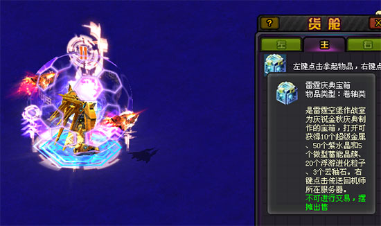 你离开了雷霆空堡,今晚真是满载收获而归啊!不过宝箱到哪里去了呢?别急,新春庆典大使·萱萱正等着你。原来为防宝箱受到损伤,雷霆空堡相当贴心地帮你把获得的宝箱跳跃传送到了她那儿。只要在当天23:59前向新春庆典大使·萱萱领取宝箱,这次活动就圆满完成了哦!