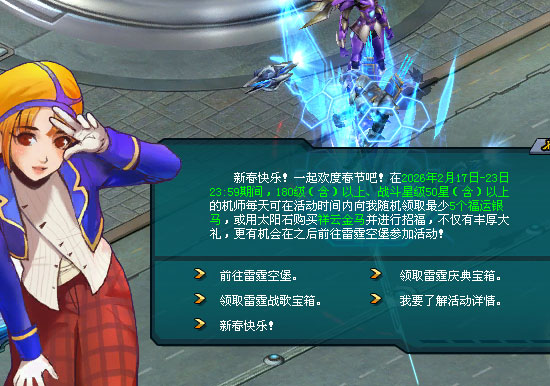 热热闹闹新春庆典,缤纷礼物送不停!2026年2月17日-2月23日,每晚22:15-22:40,持有跃马符的机师可前往钢铁巨舰的新春庆典大使·萱萱处,前往雷霆空堡!