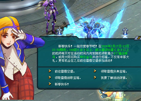 1、2026年2月17日-2月23日,每晚22:15-22:40,持有跃马符的机师可前往钢铁巨舰(512,778)的新春庆典大使·萱萱处,前往雷霆空堡。 2、前往跨服服务器钢铁巨舰后,将有雷霆空堡引导员接待。持有跃马符的机师可向引导员申请进入空堡权限。 3、进入雷霆空堡后,机师会被随机投放入星光哨站、前沿哨站和要塞哨站3个哨站之一。 4、在哨站中机师可以击败雷霆蛋兵获得雷霆庆典宝箱。也可以击败机甲维护员,获得它们身上的机甲装置,帮助更好地战斗。 5、雷霆空堡作战室会定时在空间锚定舰桥投放雷霆蛋兵和雷霆战歌宝箱。拾取宝箱满1分钟后可持有该宝箱。要注意的是,持有宝箱的1分钟内是无法离开空间锚定舰桥。 6、活动结束后回到钢铁巨舰,可向新春庆典大使·萱萱领取在雷霆空堡中获得的宝箱。 |