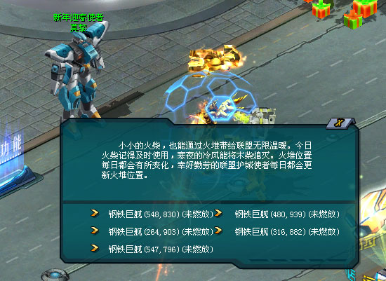 每晚19:00-23:59,勤劳的联盟护城使者都会将联盟四周散落在地上的树枝堆垒成火堆,供机师们点燃篝火。机师们可在钢铁巨舰四周寻找。
