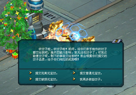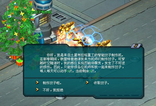 新春活动期间,来自土星布拉格重工的智能饺子制作机将带领所有机师包饺子,让大家欢欢喜喜过新年,团团圆圆吃饺子。虽然原本应该由它为机师们制作饺子,但是由于意外,机师只好自己动手了。其实认真想一想,每天动手包3次饺子,不也是种乐趣吗?