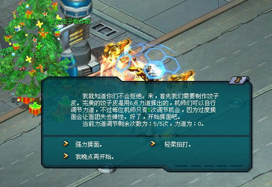 什么?担心自己不会包饺子?没有关系,智能饺子制作机已经为机师列好了详细步骤,以机师的聪明才智,很快可以学会的。 首先,机师要控制好自己的力道,精准使用6点力道进行揉面。也许一开始没办法控制好力道,但是你有5次调整力道的机会哦,机师。相信你,一定会成功的!
