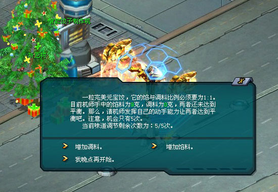完成揉面后,当然就是馅料的调味了。这个步骤也很简单,肯定难不倒机师。只要将馅料与调料的比例控制在1:1,就能制作出味道鲜美的馅料了。同样的,机师你有5次调节的机会。