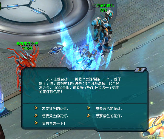 唰唰唰,你东奔西跑,没用多长时间就利索地收集了一堆材料。美丽的花灯,你来啦! 你兴致勃勃地在兰诺德机械师·朗科那,按下制造花灯的按钮。嘿!花灯有红、蓝、黄、紫这四种颜色选择,该选择哪种呢? 不如,红色吧!红红火火和喜庆的元宵节非常配!