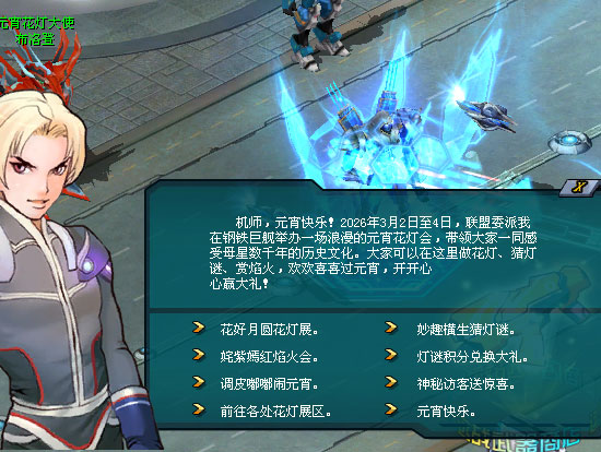 新春的喜庆气息还在星空中弥漫,元宵节已经悄然到来。这次联盟政府为钢铁巨舰的机师们准备了各种元宵节活动,当传统文化与太空科技相碰撞,会给我们带来怎样的快乐感受呢? 不管怎样,你一定不要错过花好月圆花灯展。今年的花灯展2026年3月2日7:00-3月4日23:59,元宵花灯大使·布洛登想邀请机师们亲手制作花灯,然后再将这些喜庆漂亮的花灯,亲手挂在花灯展点上!