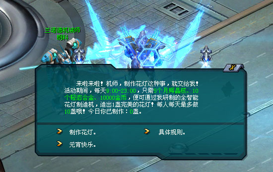 兰诺德机械师·朗科看到你来找他做花灯,非常高兴!因为他研制的全智能花灯制造机终于能大显身手了!仅需5个月辉晶核、10个轻态合金、10000金币,便可造出1盏完美的花灯! 月辉晶核用于提供花灯的灯源,轻态合金用于制作花灯的支架,而这10000金币,则是用于搭建花灯的色彩转换模组,这样你便可以在制作花灯时选择喜欢的色彩了! 不过,每人每天最多只能制作10盏花灯。并且,每制作完1盏花灯后,全智能制造机都需要保养1个小时后,才能继续启动。