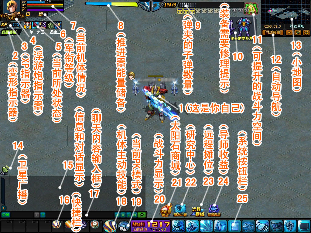 | 7 | 当前机体情况。HP:机体受损情况。PW:引擎功率。EN:能源舱能量。DF:能量力场。 |