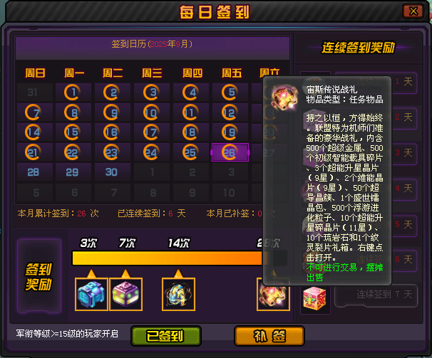 军衔等级>=15级的玩家可在每日8:00-23:59点击“每日签到”按钮,打开签到系统界面进行签到,签到分为7天循环签到及月累计签到。
