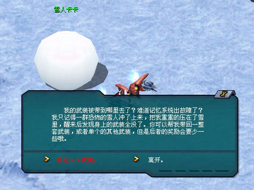 从迪亚斯这里我们证实了卡卡果然遭到了袭击,而且想要让他复原就必须重新夺回维持卡卡生命的武装,那些武装现在就藏在恐怖雪人的身上。了解到这些消息后,我们还是去看看卡卡本人吧。远远的你就发现有个大雪球躺在雪地上,难道那就是卡卡吗?