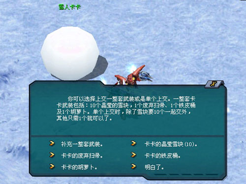 讯问后得知,这真的就是卡卡。只有将那些武装找回来,他才会恢复原来的样子。你可以选择上交一整套武装或是单个上交。一整套卡卡武装包括:10个晶莹的雪块,1个废弃扫帚、1个铁皮桶及1个胡萝卜。单个上交时,除了雪块要10个一起交外,其他只需1个就可以了。
