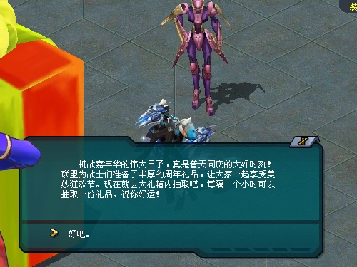 看到没,这个巨大的耀眼的周年大礼箱里,有联盟后勤部为大家精心准备的礼品——安茜负责管理大礼箱,她可是非常欢迎机师们去抽取礼品呢。