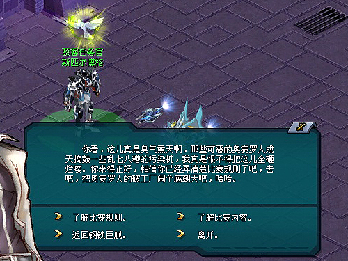 了解完情况,你就可以去找高迪了。他也在钢铁巨舰上,等着将你送去绿色骇客竞技场。进入骇客竞技场后,迅速找到骇客任务官·斯匹尔博格,他正等着对你进行实地指导。