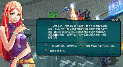 女机师用电子组件从欧蕾西亚那里换得可可粉、糖粉、香料三种原料后,右键点击其中任意一种原料,就可以制作出甜蜜的浓情巧克力了!辛苦得来的巧克力自然会有不凡的功效,食用后就可直接获得奖励咯。还等什么,快来参加浓情巧克力的制作吧!