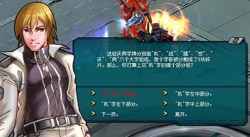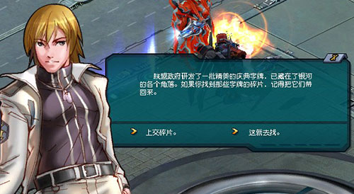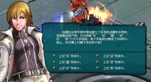 字牌分别由“机”、“战”、“盛”、“世”、“庆”、“典”六个大字组成。 所有这些碎片都被藏在银河的各个角落。贪婪的奥赛罗人却眼疾手快,所有的碎片都落入了他们的手中!因此,每个机师都得通过击杀奥赛罗机体,搜罗这些碎片。