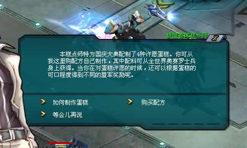 安格鲁森是全宇宙最伟大的糕点师,他会先向你介绍4种节日蛋糕,分别是水果蛋糕、奶油蛋糕、巧克力蛋糕和冰激凌蛋糕,这4种节日蛋糕的口味各不相同,但全都是他的拿手绝活。