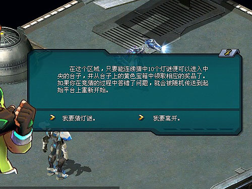 如果你看到的是柠檬黄彩灯,当然就表明你是在黄色花灯区域里。这个区域的规则相对要简单一些。只要能连续猜中10个灯谜,便可以进入中央平台,并从台子上的黄色宝箱中领取相应的奖品。不过,如果你在竞猜的过程中没能一口气答对10个问题,就会在答错题目时被传送到起始平台上重新开始咯。